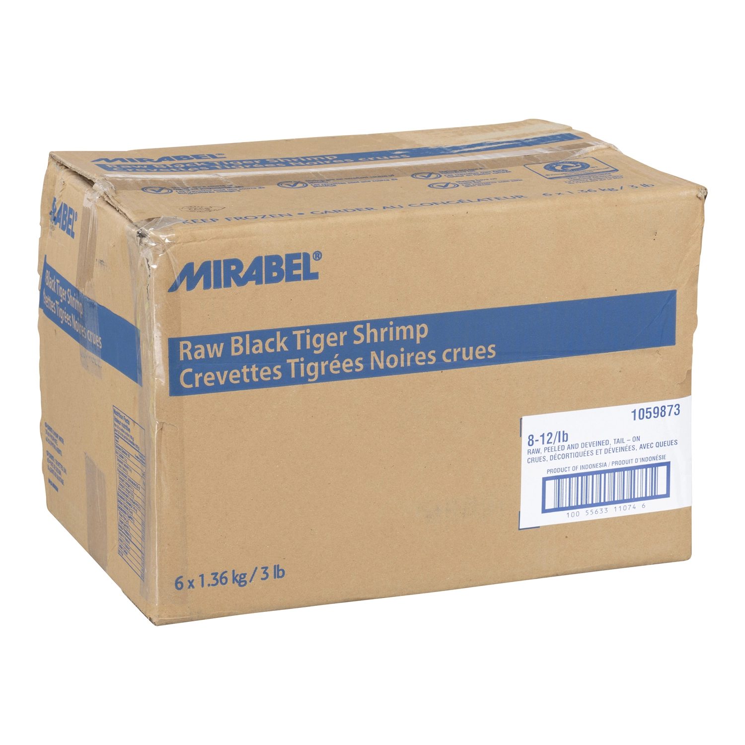 Mirabel, 6 x 1.36 kg / 3 lb, Black Tiger Shrimp, Raw, Peeled and Deveined, Tail-On, 8-12 ct/lb