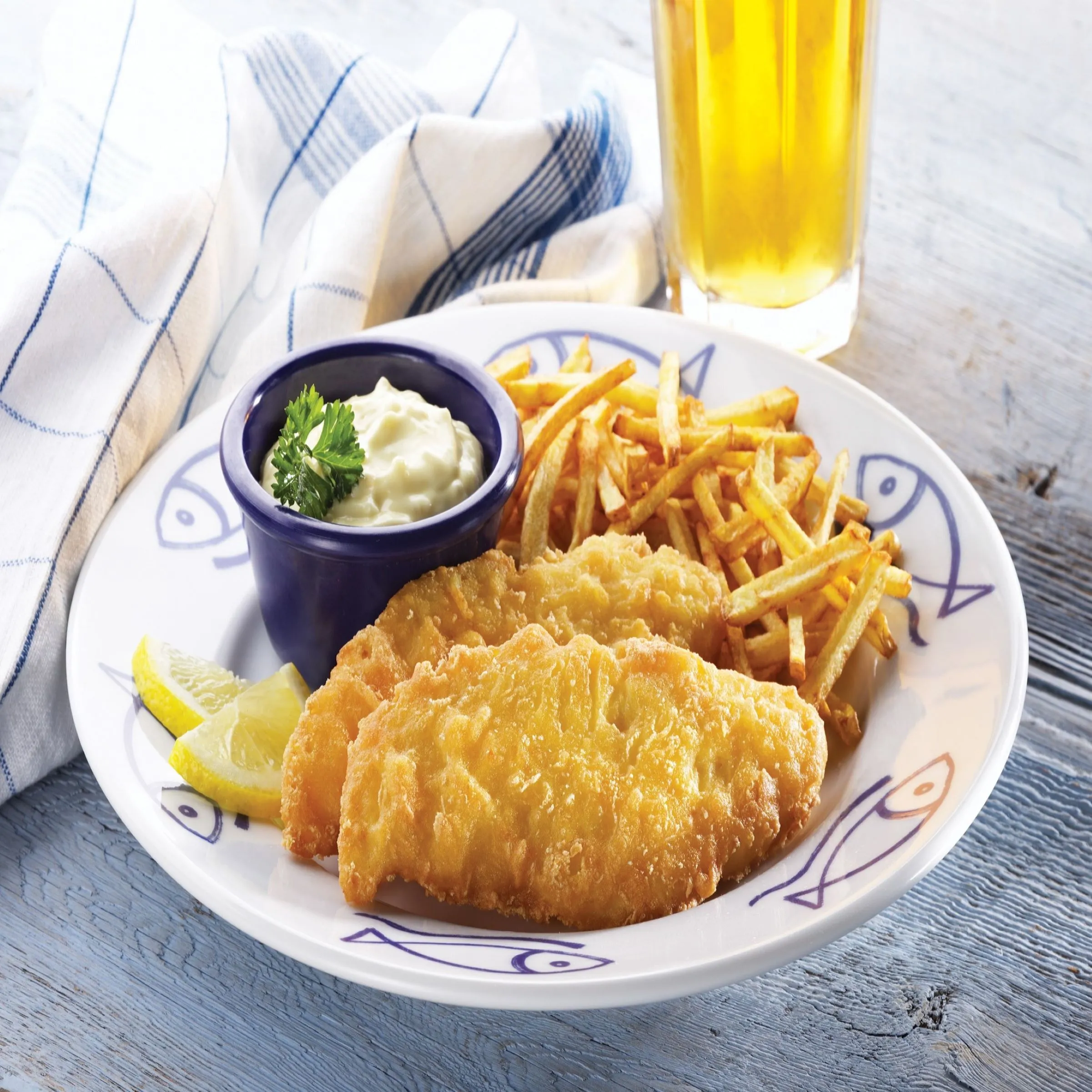Aiglefin, Bière, Huile de canola, Farine (blé, maïs), Chapelure de blé grillée, Eau, Amidon de blé, Amidon de maïs modifié, Sucres (maltodextrine, dextrine), Sel, Protéines de soya, Huile de palme modifiée, Poudre à pâte, Phosphate de sodium (pour retenir l’humidité), Cellulose modifiée, Gomme de guar, Rocou, Épices. Contient : Aiglefin (poisson), Orge, Blé, Soya.