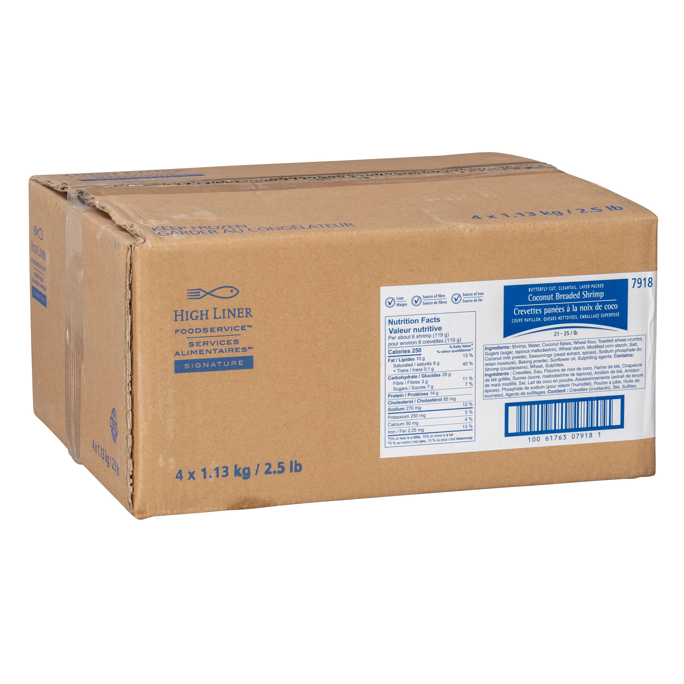 High Liner Services Alimentaires Signature, 4 x 1.13 kg / 2.5 lb, Crevettes panées à la noix de coco, Coupe papillon, queues nettoyées, emballage superpose, 21 - 25 / lb