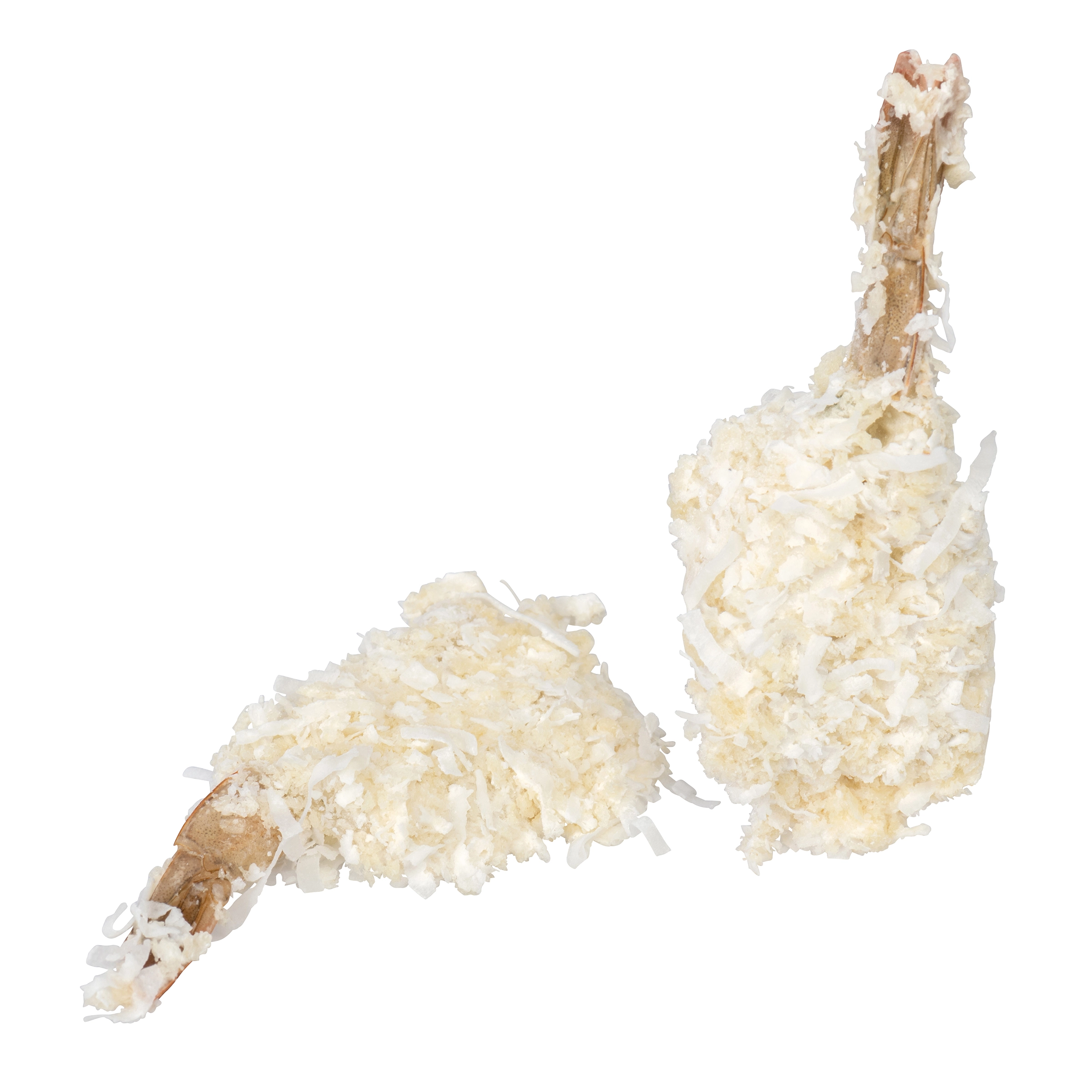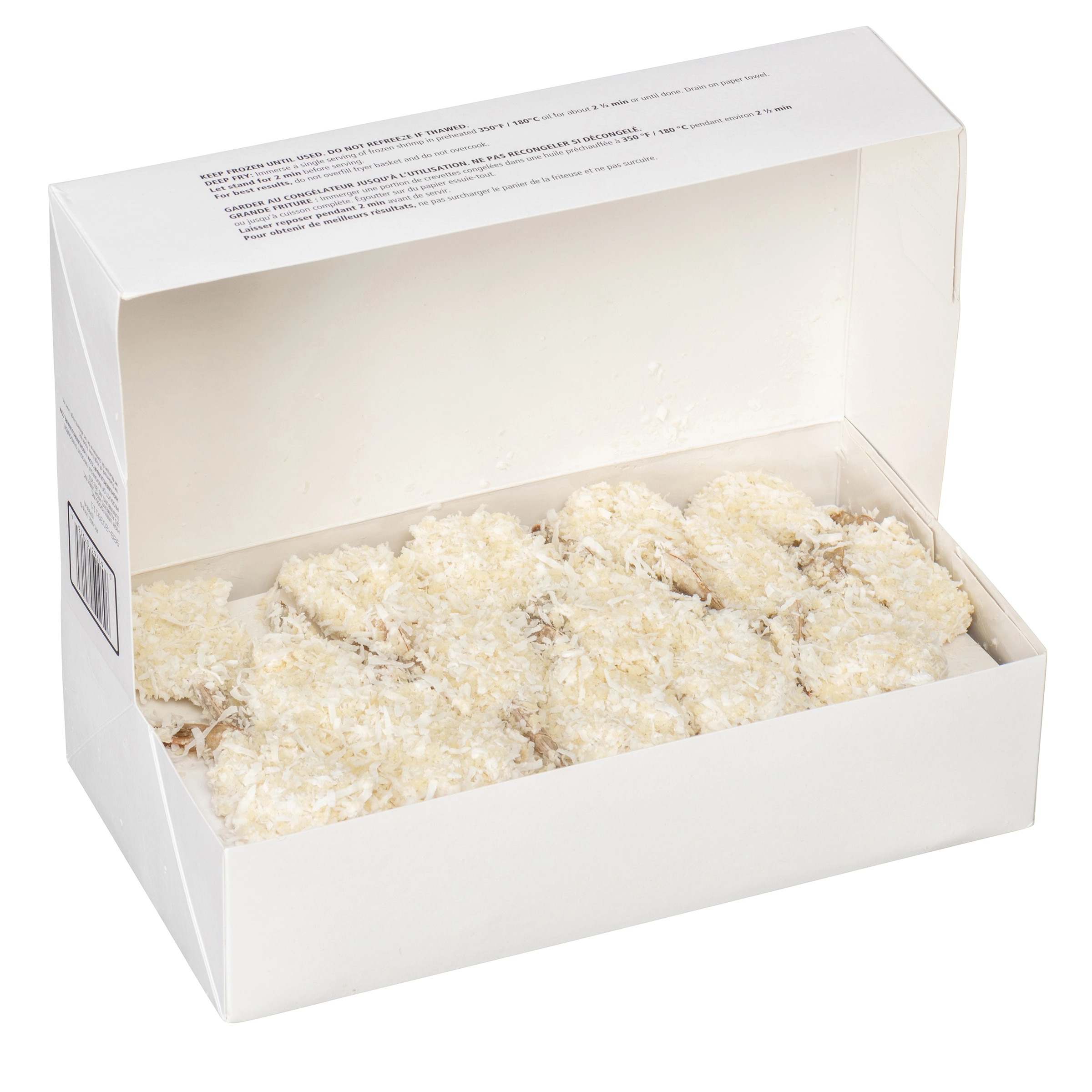 Crevettes, Eau, Flocons de noix de coco, Farine de blé, Chapelure de blé grillée, Sucres (sucre, maltodextrine de tapioca), Amidon de blé, Amidon de maïs modifié, Sel, Lait de coco en poudre, Assaisonnements (extrait de levure, épices), Phosphate de sodium (pour retenir l’humidité), Poudre à pâte, Huile de tournesol, Agents de sulfitages. Contient : Crevettes (crustacés), Blé, Sulfites.
