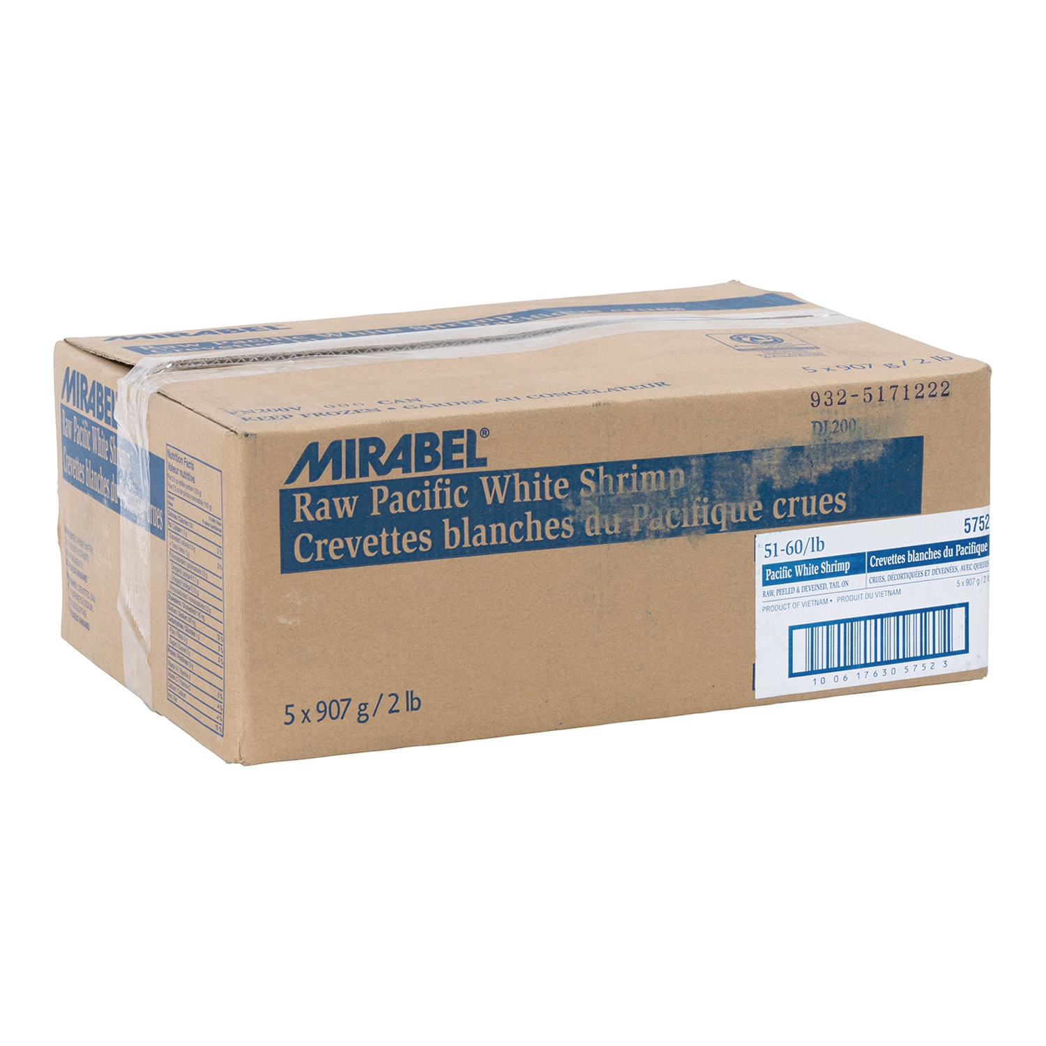 Mirabel, 5 x 907 g / 2 lb, Crevettes blanches du Pacifique, Crues, Décortiquées et Déveinées, Avec Queue, 51-60/lb