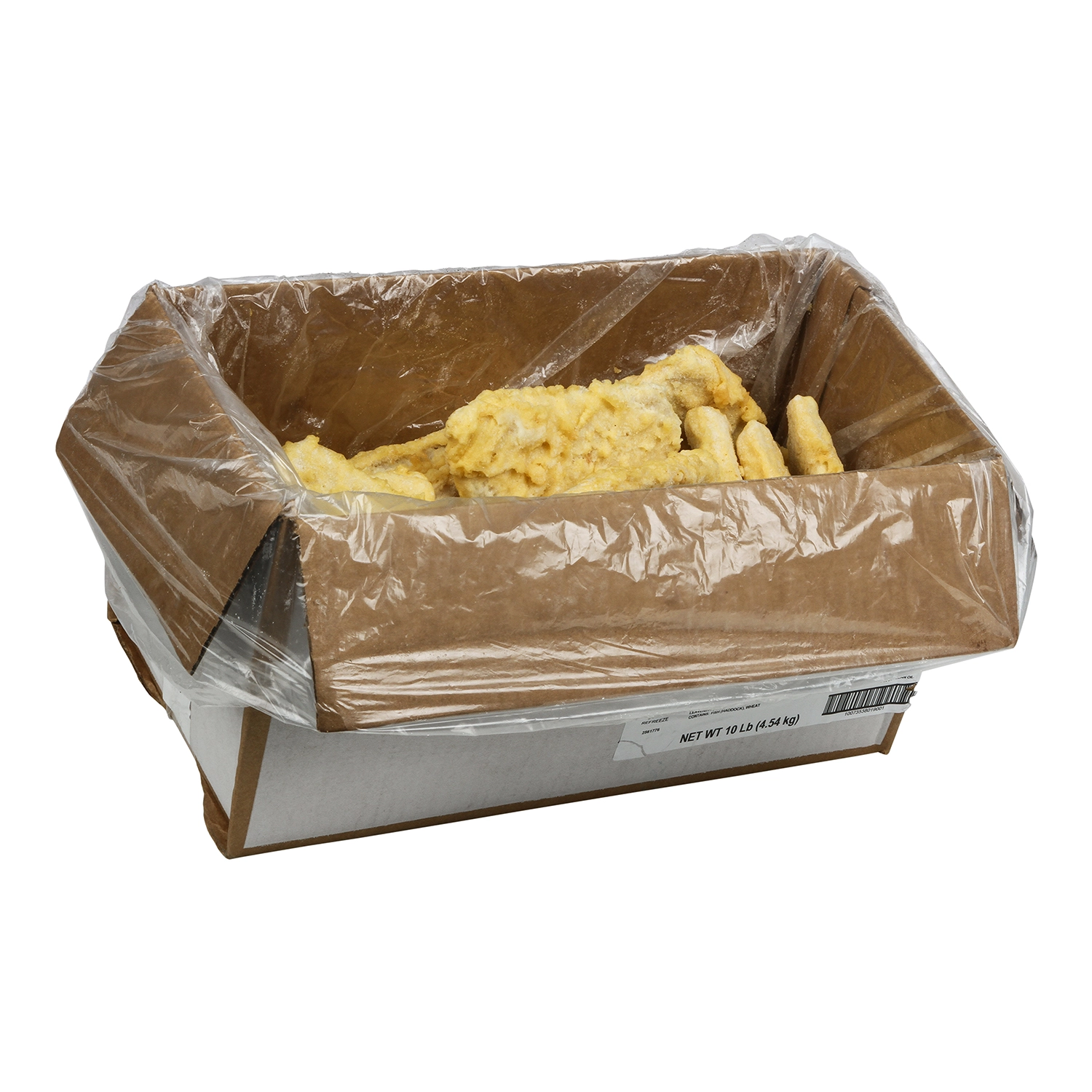 HADDOCK, WATER, ENRICHED WHEAT FLOUR (FLOUR, NIACIN, REDUCED IRON, THIAMINE MONONITRATE, RIBOFLAVIN, FOLIC ACID), VEGETABLE OIL (CANOLA OIL, COTTONSEED OIL, AND/OR SOYBEAN OIL), YELLOW CORN FLOUR, MODIFIED CORN STARCH, BLEACHED WHEAT FLOUR, CONTAINS 2% OR LESS OF: SALT, ENRICHED YELLOW CORN FLOUR CORN FLOUR, NIACIN, REDUCED IRON, THIAMINE MONONITRATE, RIBOFLAVIN, FOLIC ACID), ENRICHED BLEACHED WHEAT FLOUR (FLOUR, NIACIN, REDUCED IRON, THIAMINE MONONITRATE, RIBOFLAVIN, FOLIC ACID), IODIZED SALT, LEAVENING (SODIUM ALUMINUM PHOSPHATE, SODIUM BICARBONATE), SPICES.