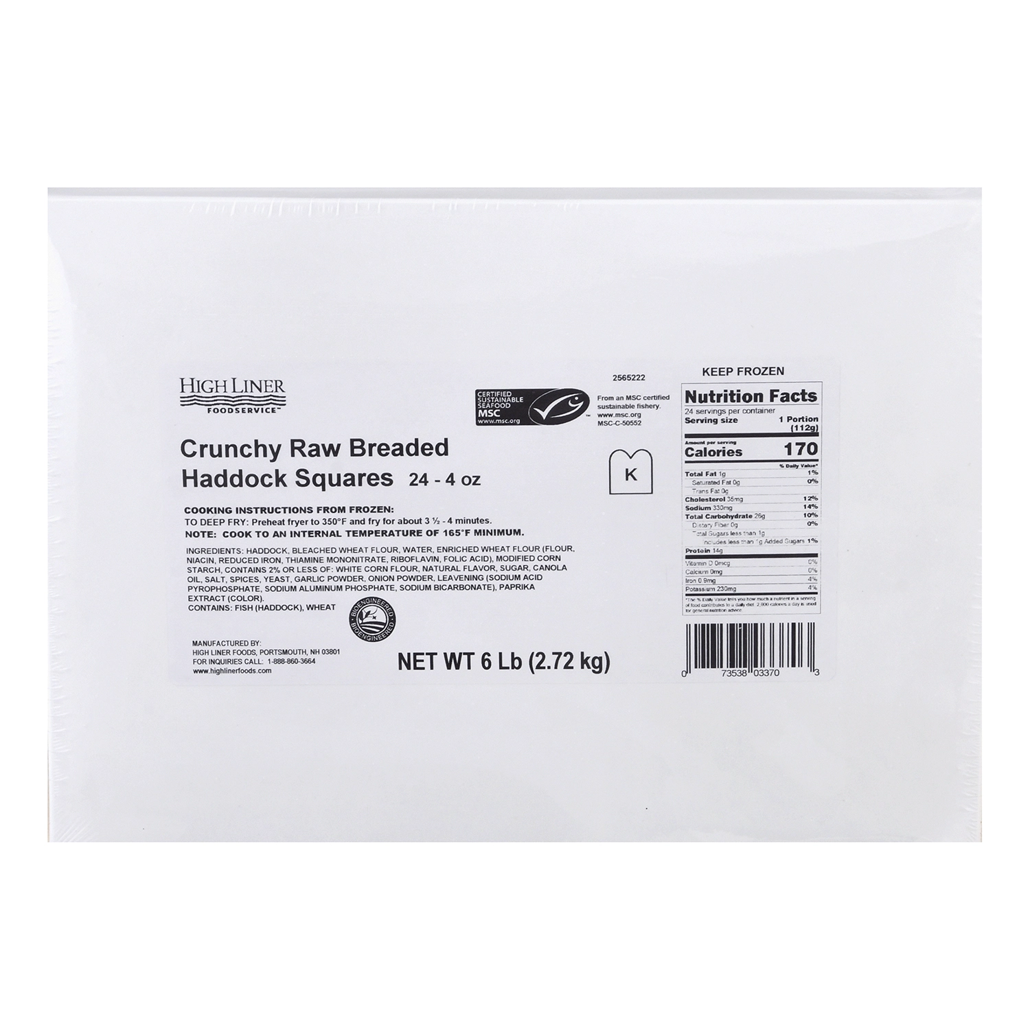 High Liner Foodservice Crunchy Breaded Haddock Squares add zing to any dish. Here, premium wild caught Haddock are breaded in a light, crunchy coating that perfectly preserves the mildly sweet, creamy flakiness of this species when deep-fried. In 4 minutes or less, you have that ideal blend of golden crispy, melt-in-your-mouth flakiness patrons truly crave, with the consistency and plate coverage you demand. These highly versatile Haddock Squares aren't just a great option for your menu, they're a menu must.