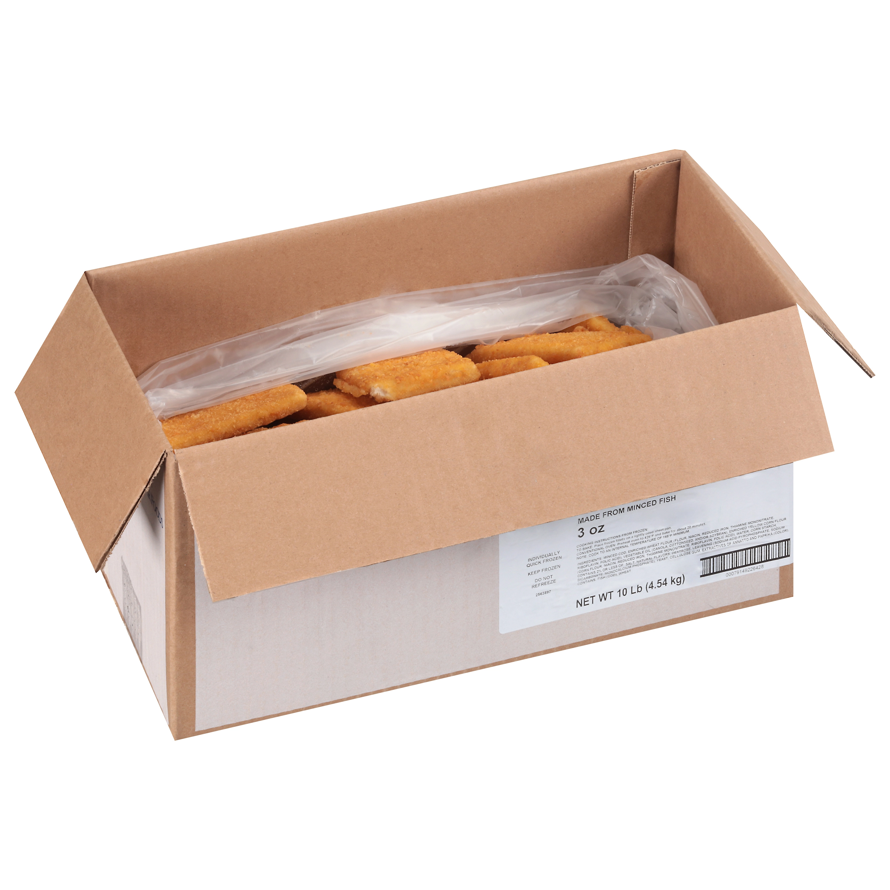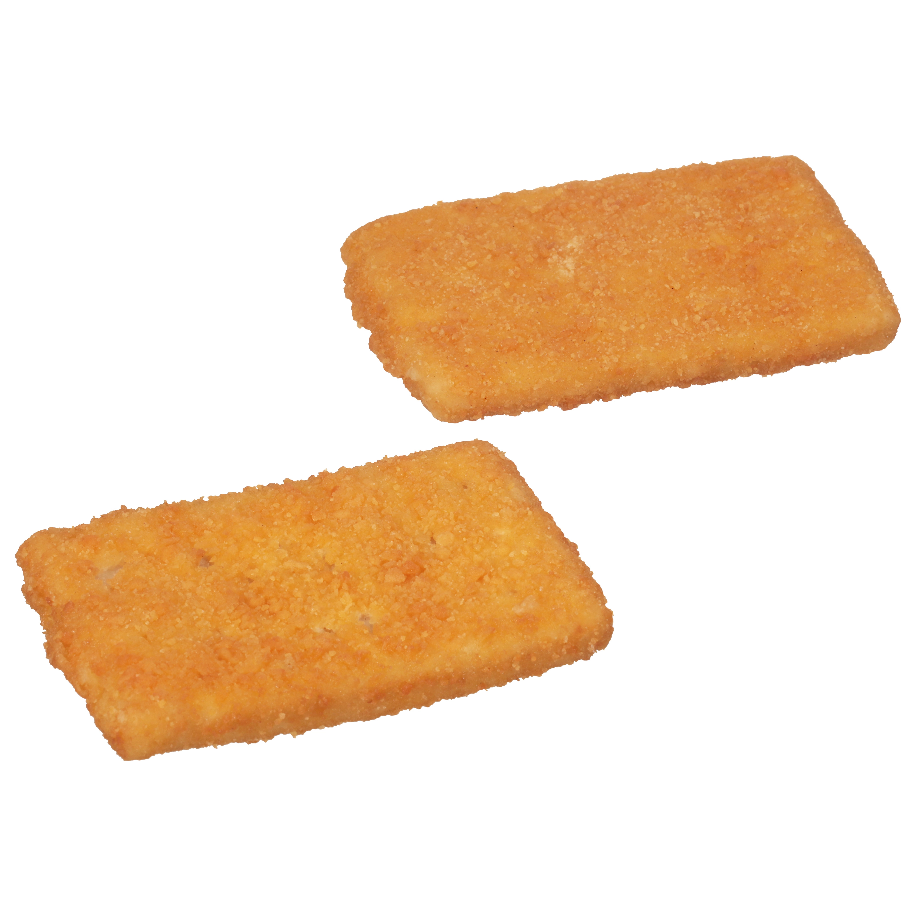 MINCED COD, ENRICHED WHEAT FLOUR (FLOUR, NIACIN, REDUCED IRON, THIAMINE MONONITRATE, RIBOFLAVIN, FOLIC ACID), VEGETABLE OIL (CANOLA, COTTONSEED, AND/OR SOYBEAN), ENRICHED YELLOW CORN FLOUR (CORN FLOUR, NIACIN, REDUCED IRON, THIAMINE MONONITRATE, RIBOFLAVIN, FOLIC ACID), WATER, CORN STARCH, CONTAINS 2% OR LESS OF: SALT, NATURAL FLAVORS, DEXTROSE, LEAVENING (SODIUM ACID PYROPHOSPHATE, SODIUM BICARBONATE, MONOCALCIUM PHOSPHATE), YEAST, CELLULOSE GUM, EXTRACTIVES OF ANNATTO AND PAPRIKA (COLOR).