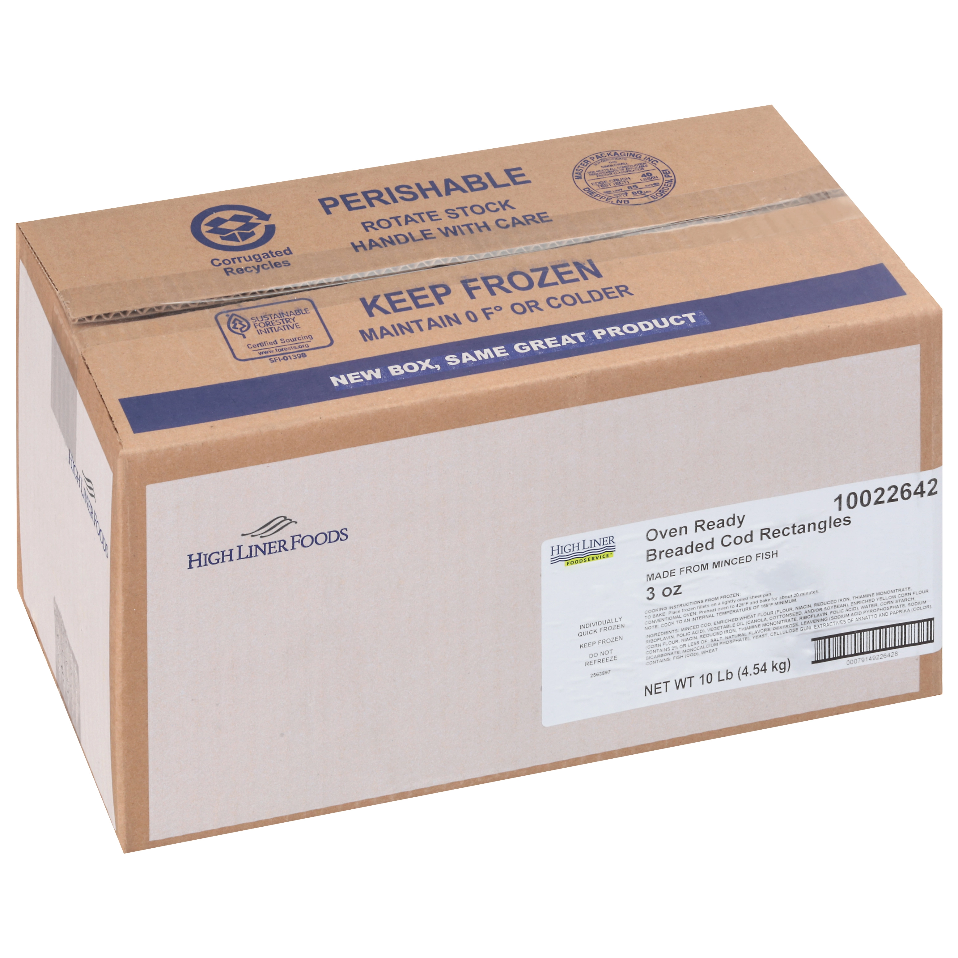 10 Lb (4.54 kg) Oven Ready Breaded Cod Rectangles, Made From Minced Fish, 3 oz