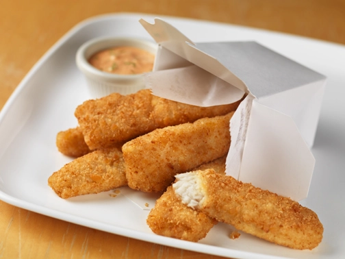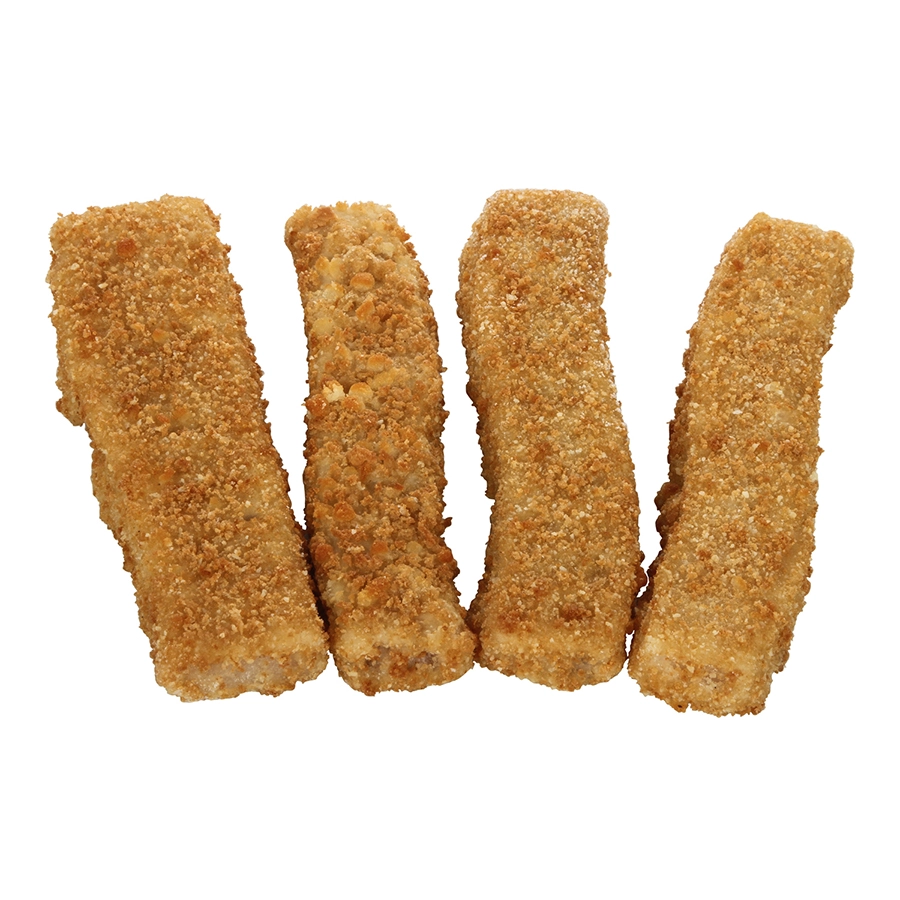 65.8% ALASKA POLLOCK; 34.2% BATTER AND BREADING: WHOLE WHEAT FLOUR, ENRICHED WHEAT FLOUR (FLOUR, NIACIN, FERROUS SULFATE, THIAMINE MONONITRATE, RIBOFLAVIN, FOLIC ACID), DEHYDRATED POTATOES (POTATOES, MONO AND DIGLYCERIDES, DEXTROSE), CONTAINS 2% OR LESS OF: CORN SYRUP, WATER, POTATO FLAKES (POTATOES, MONOGLYCERIDES), SALT, TAPIOCA STARCH, RICE FLOUR, POTATO STARCH, LEAVENING (SODIUM BICARBONATE, SODIUM ALUMINUM PHOSPHATE), PALM OIL, YEAST, DEXTROSE, SUGAR, NATURAL FLAVOR. PREFRIED IN CANOLA, COTTONSEED, AND/OR SOYBEAN OIL.