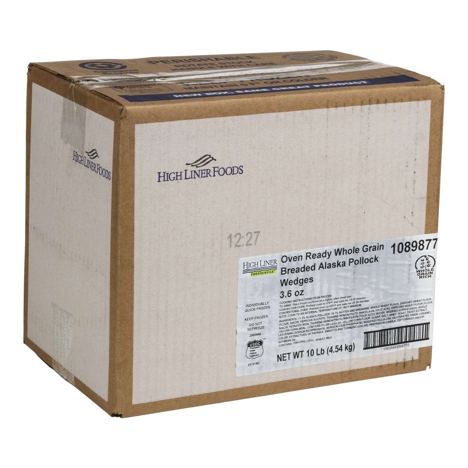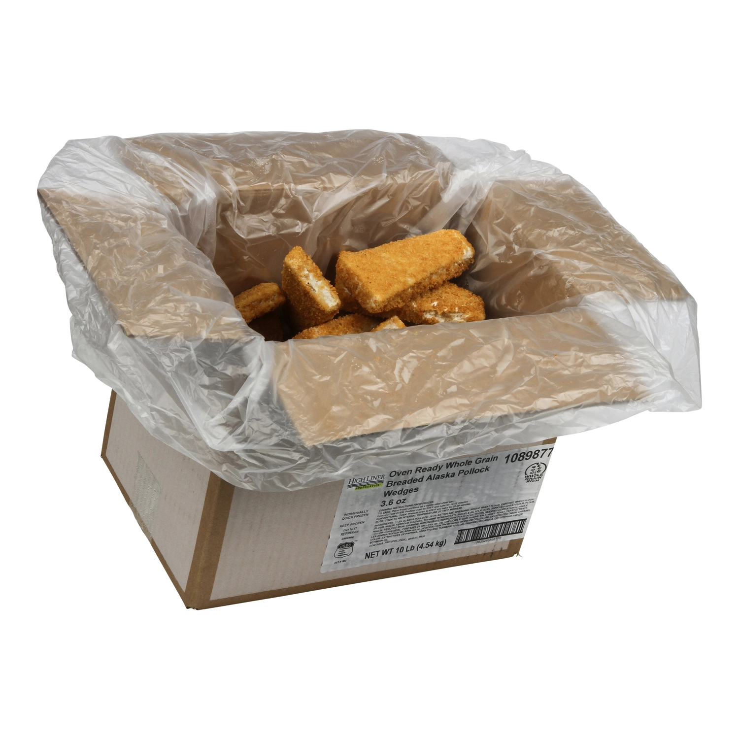 10 Lb (4.54 kg) Oven Ready Whole Grain Golden Crunchy Breaded Alaska Pollock Wedges 3.6 oz, CN, MSC