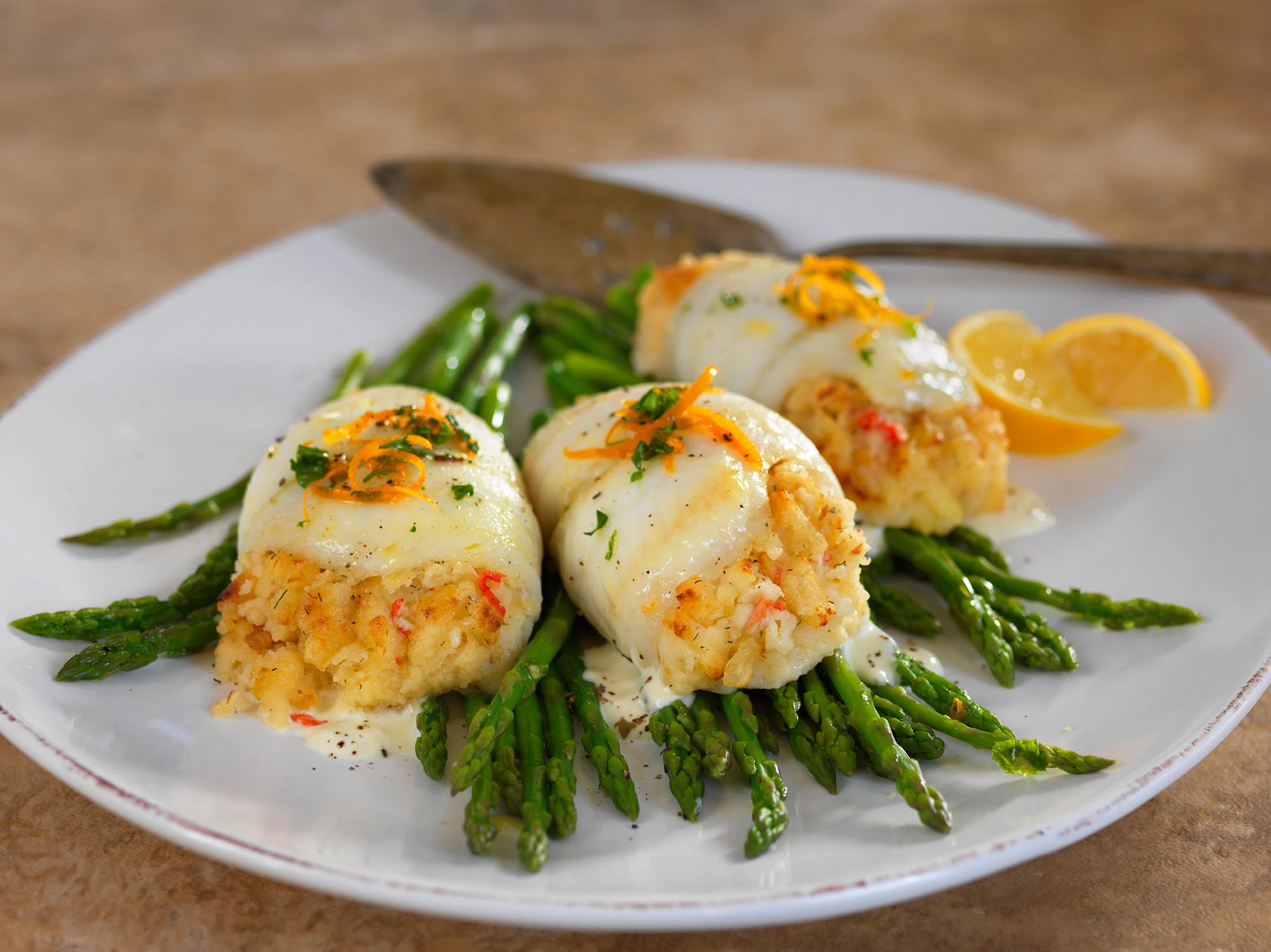 Fishery Product Sole Rolled with Scallops & Crabmeat Stuffing is as tantalizing as it sounds. The firm texture of this premium wild caught Sole beautifully holds the succulent, buttery rich Scallop and Crabmeat stuffing together, with the Sole’s mild, sweet flavor the perfect complement. And each roll microwaves or bakes from frozen in no time. It’s a dish you won’t find anywhere else that guests will be delighted to find on your menu.