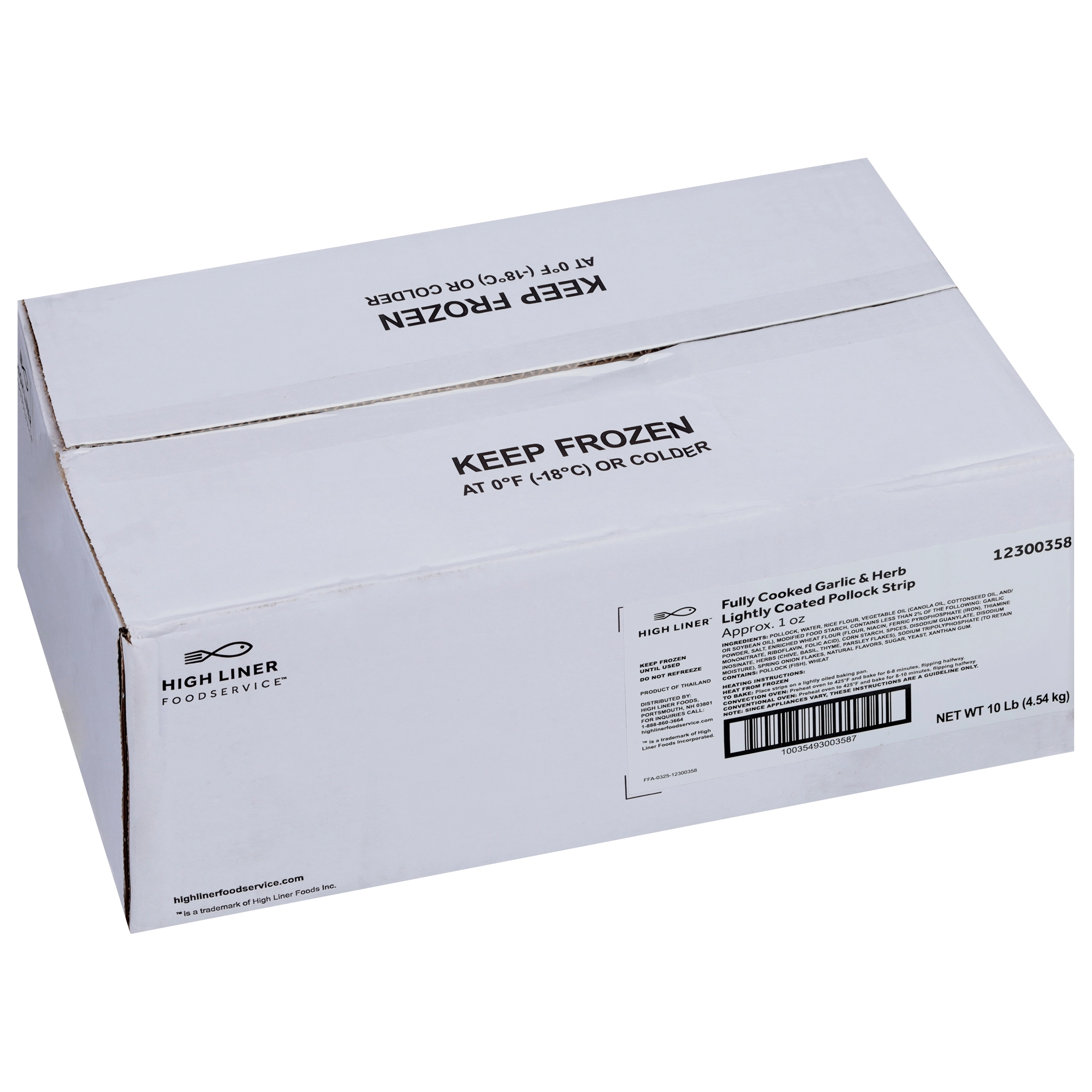 10 Lb (4.54 kg) Fully Cooked Garlic & Herb Lightly Coated Pollock Strip Approx. 1 oz, MSC
