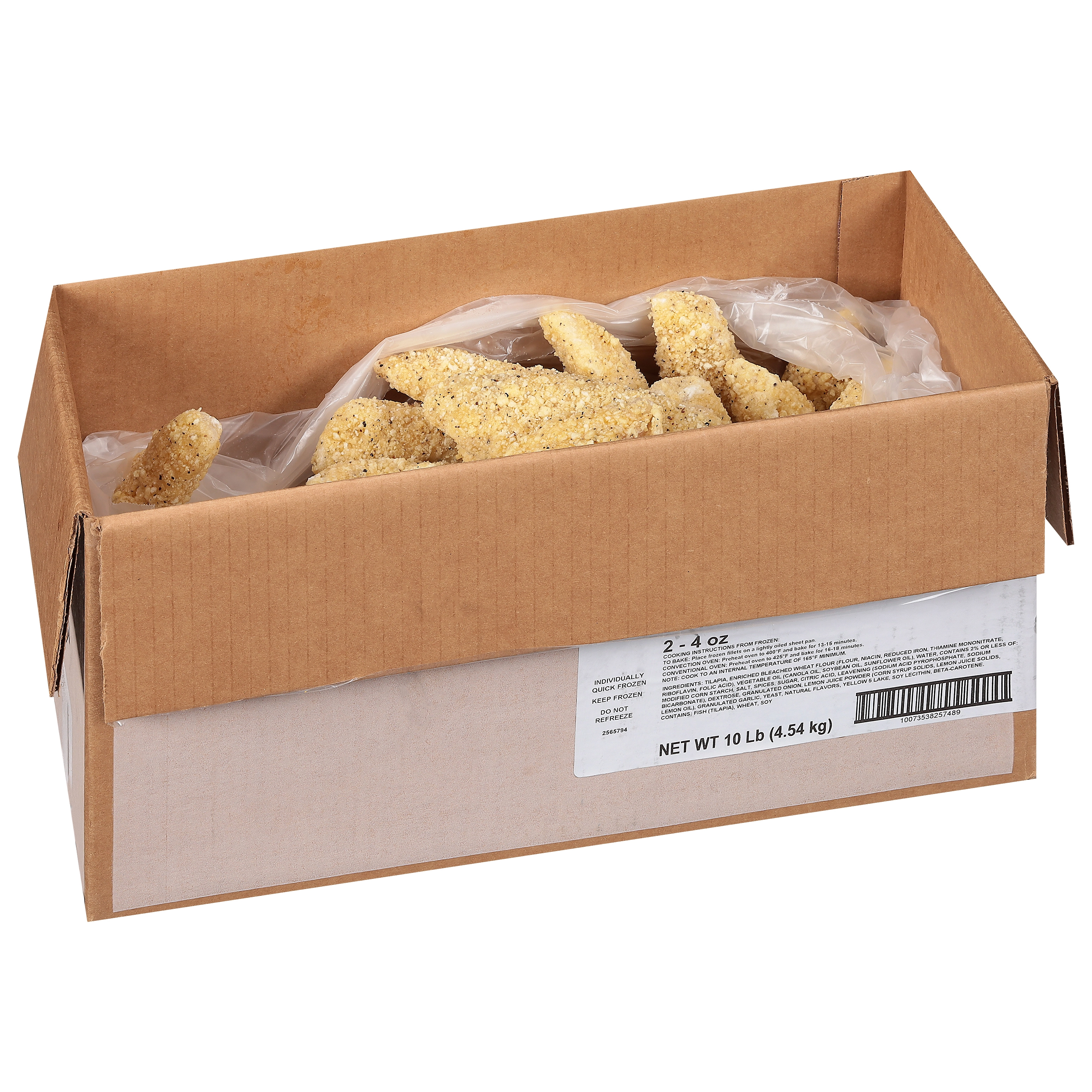 TILAPIA, ENRICHED BLEACHED WHEAT FLOUR (FLOUR, NIACIN, REDUCED IRON, THIAMINE MONONITRATE, RIBOFLAVIN, FOLIC ACID), VEGETABLE OIL (CANOLA OIL, SOYBEAN OIL, SUNFLOWER OIL), WATER, CONTAINS 2% OR LESS OF: MODIFIED CORN STARCH, SALT, SPICES, SUGAR, CITRIC ACID, LEAVENING (SODIUM ACID PYROPHOSPHATE, SODIUM BICARBONATE), DEXTROSE, GRANULATED ONION, LEMON JUICE POWDER (CORN SYRUP SOLIDS, LEMON JUICE SOLIDS, LEMON OIL), GRANULATED GARLIC, YEAST, NATURAL FLAVORS, YELLOW 5 LAKE, SOY LECITHIN, BETA-CAROTENE.