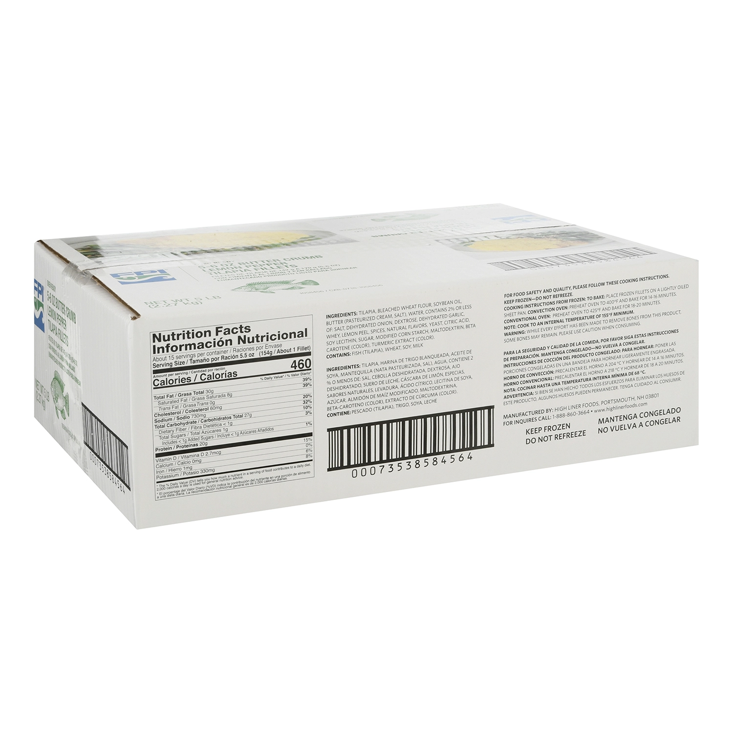 TILAPIA, BLEACHED WHEAT FLOUR, SOYBEAN OIL, BUTTER (PASTEURIZED CREAM, SALT), WATER, CONTAINS 2% OR LESS OF: SALT, DEHYDRATED ONION, DEXTROSE, DEHYDRATED GARLIC, WHEY, LEMON PEEL, SPICES, NATURAL FLAVORS, YEAST, CITRIC ACID, SOY LECITHIN, SUGAR, MODIFIED CORN STARCH, MALTODEXTRIN, BETA CAROTENE (COLOR), TURMERIC EXTRACT (COLOR).